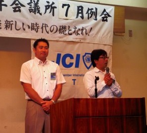 7/17(木)伊東商工会議所にて7月例会を開催しました。新入会員の石井良君のお子さんの誕生をメンバーで祝福し、恥ずかしながらもお礼の言葉を述べていました。 司会に関しましても新入会員の土谷真二君が初挑戦し、緊張しながらも無難にこなしていました。